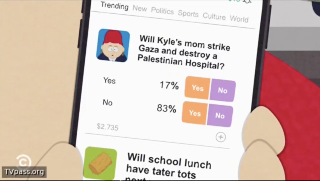 As in: “Will Kyle [Broflovski’s Jewish] Mom Strike Gaza and Destroy a Palestinian Hospital?”