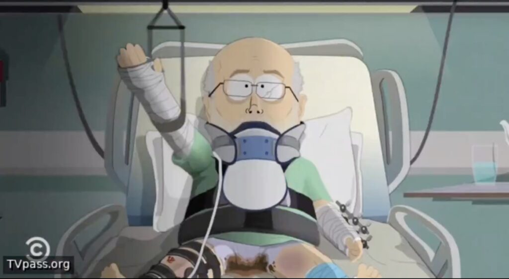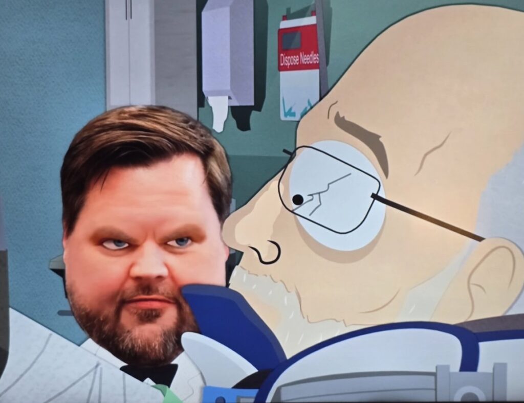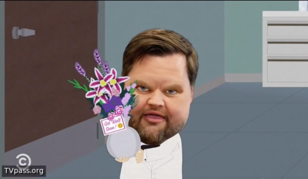 JD probably won’t be bragging about the pro-Choice stance he takes here, unlike like his lame attempt to neutralize his first appearance on South Park a few weeks ago. For that matter, it’s unlikely that Carr, Trump, “special advisor” Don Jr., or Benjamin Netanyahu will be bragging about their well-deserved man-handlings either.